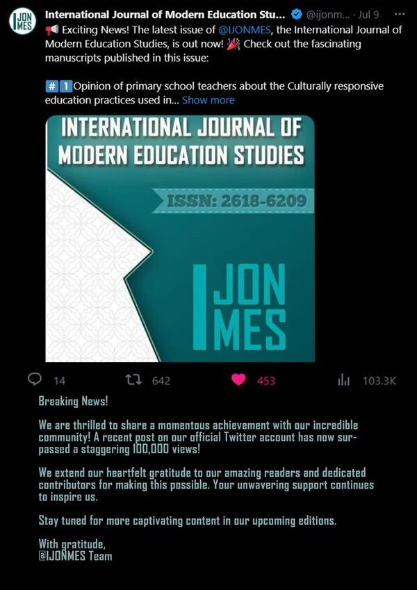 The International Journal of Modern Education Studies (IJONMES) serves as a dynamic, open-access platform for scholars, researchers, and educators across the globe. Published biannually in June and December, we are fervently dedicated to fostering the expansion of educational sciences, ensuring our content is freely accessible to all.