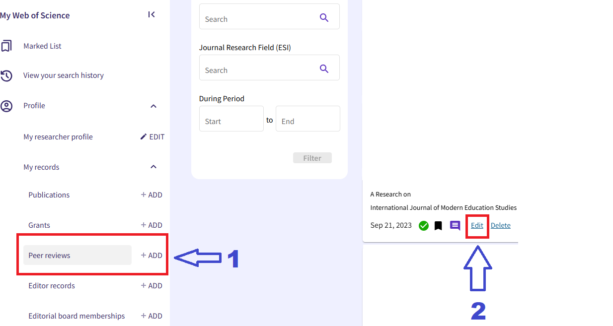 Step 1: Log into Web of Science and navigate to your profile.On the left-hand side menu, under "My records", click on “+ ADD” next to Peer reviews (see arrow ①). This will allow you to manually enter the review details. Once your review appears in the list, click on "Edit" next to the relevant review entry to complete or update the information (see arrow ②).