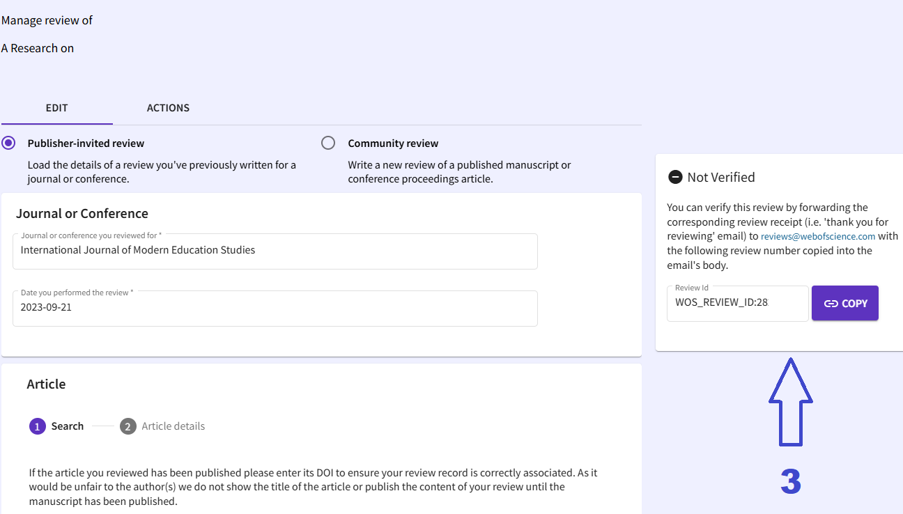 Step 2: Complete verification of your review. To verify the review, copy the Review ID (see arrow ③) and forward your review confirmation email (e.g., the thank-you email from the journal) to: Make sure to include the Review ID in the body of your email. Once processed, your review status will be updated to Verified, and it will be displayed in your Web of Science reviewer profile.